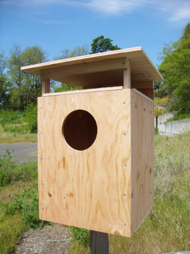 Introducing the new California Owl Box, the nesting box is constructed with the same details and materials as our original box, but instead of the pitched roof (great for the rains of the Pacific NW) this box features a sun baffle design. Essentially a double roof, with the top layer shading the inner box, and extra side ventilation holes. This design is especially suited for pole mounting in vi